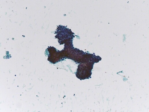 Das Fibroadenom ist der häufigste gutartige Mammatumor. Zytologisch zeigen sich monomorphe duktale Epithelzellen mit teilweise leicht vergrößerten Kernen und schmalem, homogenem Zytoplasma. Randständig sind Myoepithelzellen nachweisbar. Das Vorkommen zahlreicher bipolarer Nacktkerne gilt als pathognomonisch.